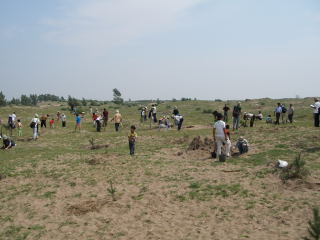住民・小学生・緑化隊で3人1組になり、みんなでニレ200本、マツ200本を植えました。子どもたちはバケツの水汲みにも元気いっぱいに走り回っていました。