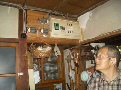お昼休憩の後は、独立型太陽光発電システムを設置している桜井さんのお宅を見学しました。1990年に桜井さんが1kWのパネルを設置した当時は、まだ電力会社の送電線とつないで余った電気を売電できる系統連系のしくみがなかったそうです。その為バッテリーに充電して夜も使いますが、それも使い切ったら電力会社から買う電気に切り替えられるようになっています。したがって毎日、発電した電気のありがたさを実感しながら暮らしているわけです。トイレは雨水利用の簡易水洗で、1回に使用する水の量はコップ1杯で済みます。まさに自然とともに暮らす家でした。
