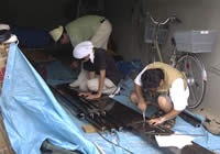 今回は、平らな陸屋根だったので、屋根の上の作業に誰でも参加することができ、中学生から70代まで6人の参加者と、FoE Japanスタッフが、設置パートナーのエコテックの指導のもとに、架台へのパネルの取り付け、配線などの作業を実際に体験しました。