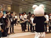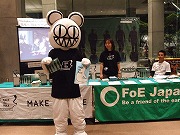 日本ツアーでの最大の会場スーパーアリーナには1日に2万人が来場。FoE Japanも20名のボランティアで活動開始、アリーナとスタンドの入口付近でファンに呼びかけました。 広い会場でもひときわ目立ったのが、レディオヘッドのマスコットの「ベア」。MAKE the RULEキャンペーンのTシャツを着て、キャンペーンのフライヤーと署名のお礼のポストカードを掲げて、署名参加を呼びかけてくれました。おかげで、多くのファンが、署名に参加してくれました! ブースはスタンド席のロビーに設置されました。スタンド席だけでも相当の観客数になるので、開場後はレディオヘッドの公演が始まるまで、大忙しでした。 終演後もブースとアリーナ出口で30分ほど活動しました。 さいたまでは、1日目に3,278筆、2日目に3,013筆、合計6,281筆の署名を集めることができました。