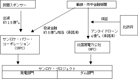 プロジェクトを実施するサンロケパワー社(SRPC)は、総合商社の丸紅(出資比率42.45%)、アメリカのサイスエナジー社(50.05%)、そして関西電力(7.5%)が共同出資してつくった現地法人である。25年間 にわたって発電事業をおこない、一定量の電力をフィリピンの国営企業であるフィリピン電力公社(NPC) に卸し売りする(電力購買契約)。