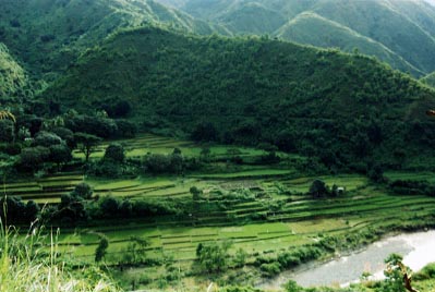 フィリピン・サンロケダムの上流の村、ティノンダンの棚田とアグノ川。ダム上流の堆積によって、川岸の棚田が土砂で埋まることが懸念されている。(1999年8月)