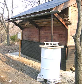 雨が屋根から竹の樋をつたい、ドラム缶に溜まる。屋根面は大きくないので、反対側にも同じものが。