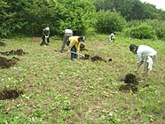 去年の春、移植したマツは、葉も大きくなり、元気に成長しています。今年の春、移植したコナラは、まだ背が低く、すぐにクズや雑草にのまれてしまいそうでした。今回あらたに12本、梅林のコナラの実生をこの日当たりのいい草地に移植しました。そして夏のあいだは、こまめに草を刈ろうと思いました。