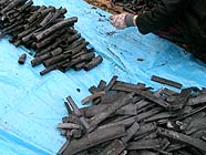 そして翌日、いよいよ炭出しです。ドラム缶のフタをあけると、あんなにぎっしり詰め込んだ竹が、1/3ぐらいのかさになっていて驚きました。竹炭はうまく焼けていて、叩くとカランカランといい音がしました。伏せ焼きのほうも、炭になった落ち葉の下からきれいに焼けた竹炭がでてきました。