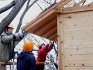 面戸(垂木の上に屋根材を置いたときにできる隙間を埋めるもの)をつける。ここでは垂木と垂木の間、桁の上に角材を釘打ちする。