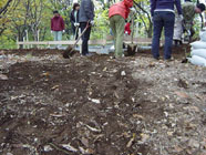 砕石の上に土を埋め戻す。これで、雨水が底の砕石をつたって、建物の外に流れるようになる。